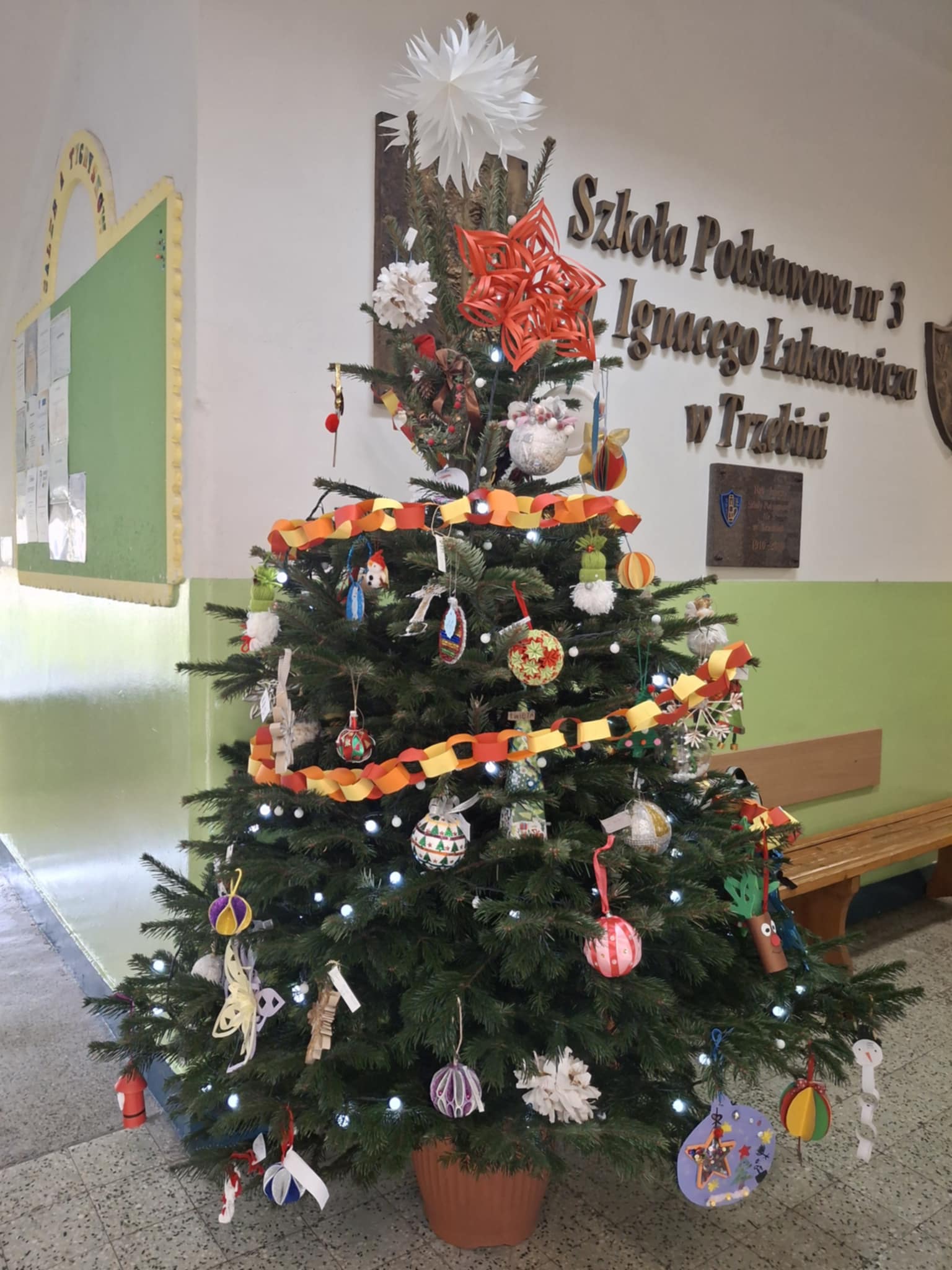 Na szkolnym korytarzu, jak co roku pojawiła się choinka, którą przystroiły własnoręcznie wykonane przez uczniów ozdoby. Bombki, aniołki, gwiazdki i łańcuchy oraz inne figurki biorą udział w szkolnym konkursie “Ozdoba choinkowa”.