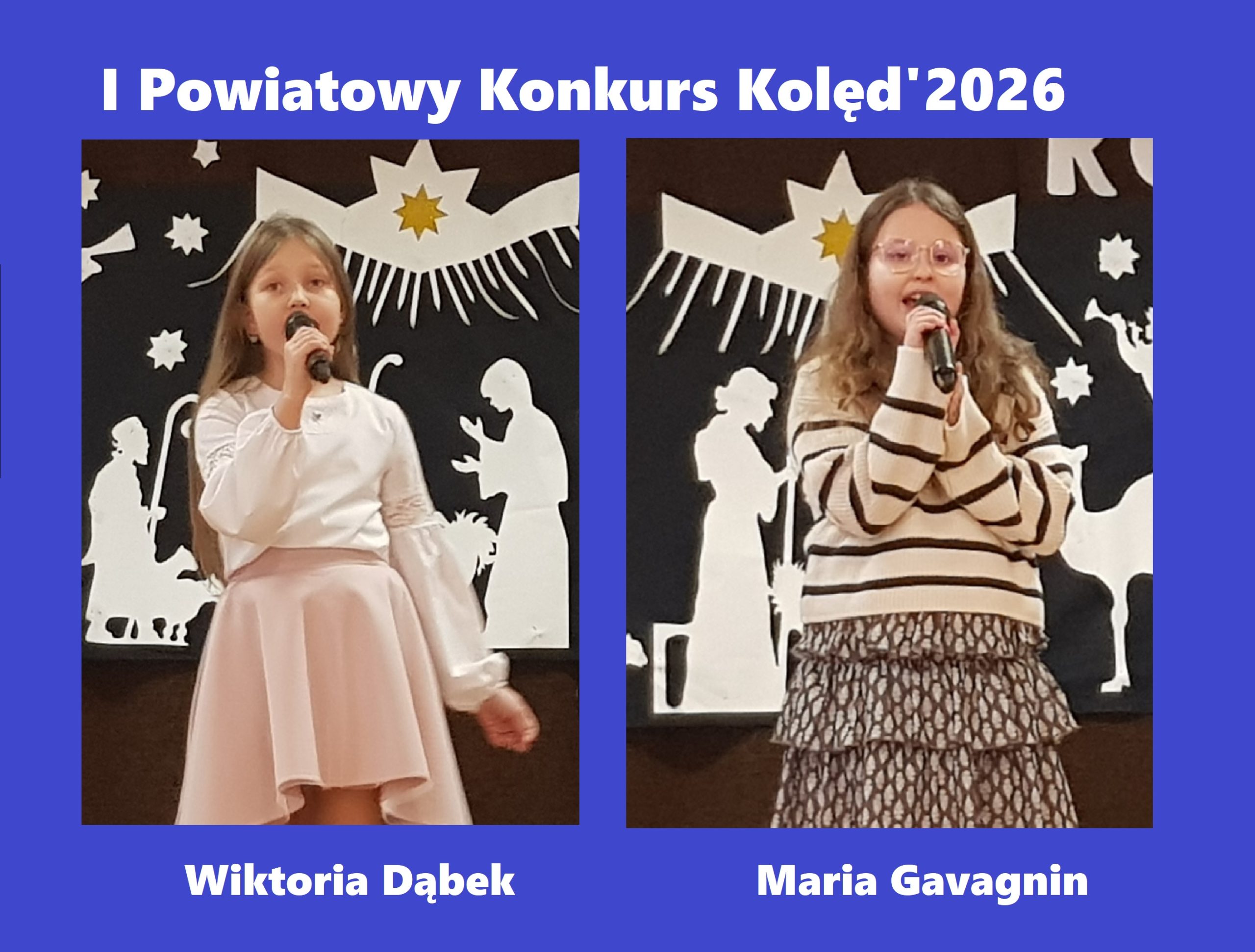 W dniu 14 stycznia 2026 roku Wiktoria Dąbek z klasy IIIb oraz Maria Gavagnin z klasy IVb reprezentowały naszą szkołę w I Powiatowym Konkursie Kolęd „NAJPIĘKNIEJSZA POLSKA KOLĘDA”. Jego organizatorem był Zespół Szkolno – Przedszkolny w Młoszowej, a honorowy patronat objął Burmistrz Miasta Trzebini Pan Jarosław Okoczuk.