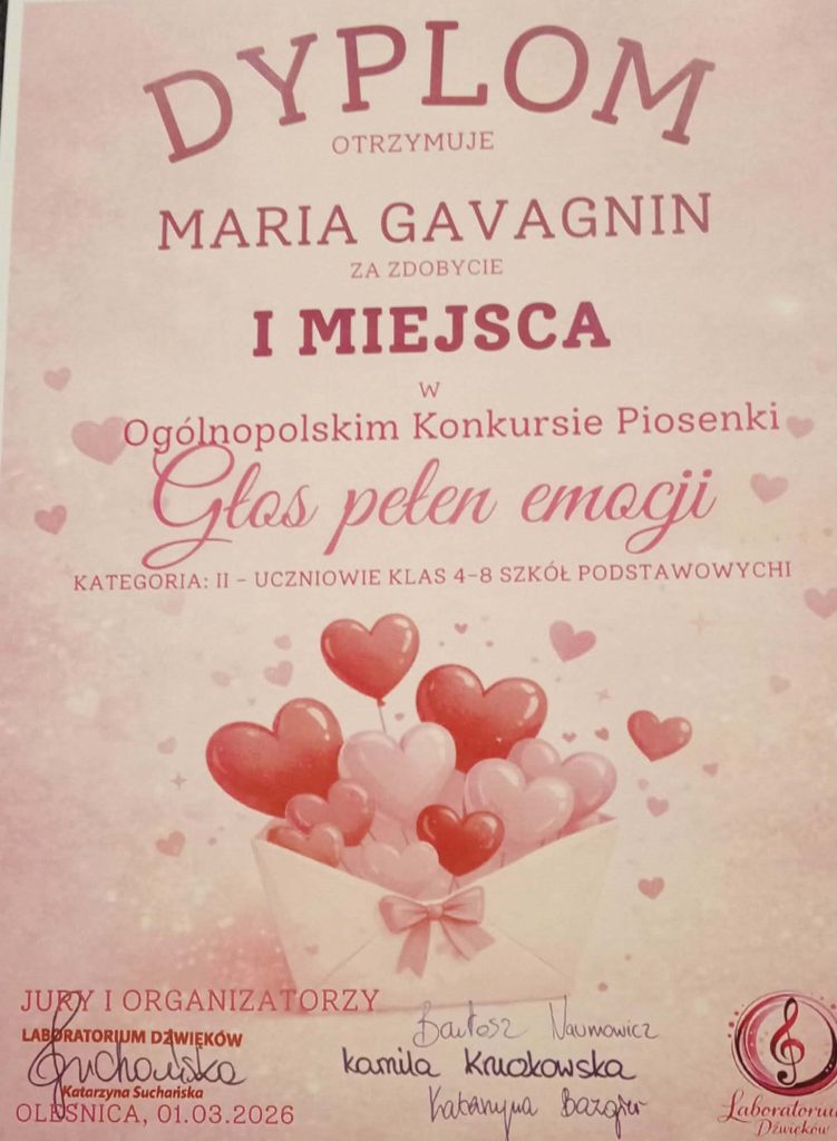 Dnia 1 marca 2026 r. nastąpiło uroczyste ogłoszenie wyników i wręczenie dyplomów. Z wielką dumą informujemy, że nasza wspaniała młoda wokalistka zajęła w nim I miejsce.