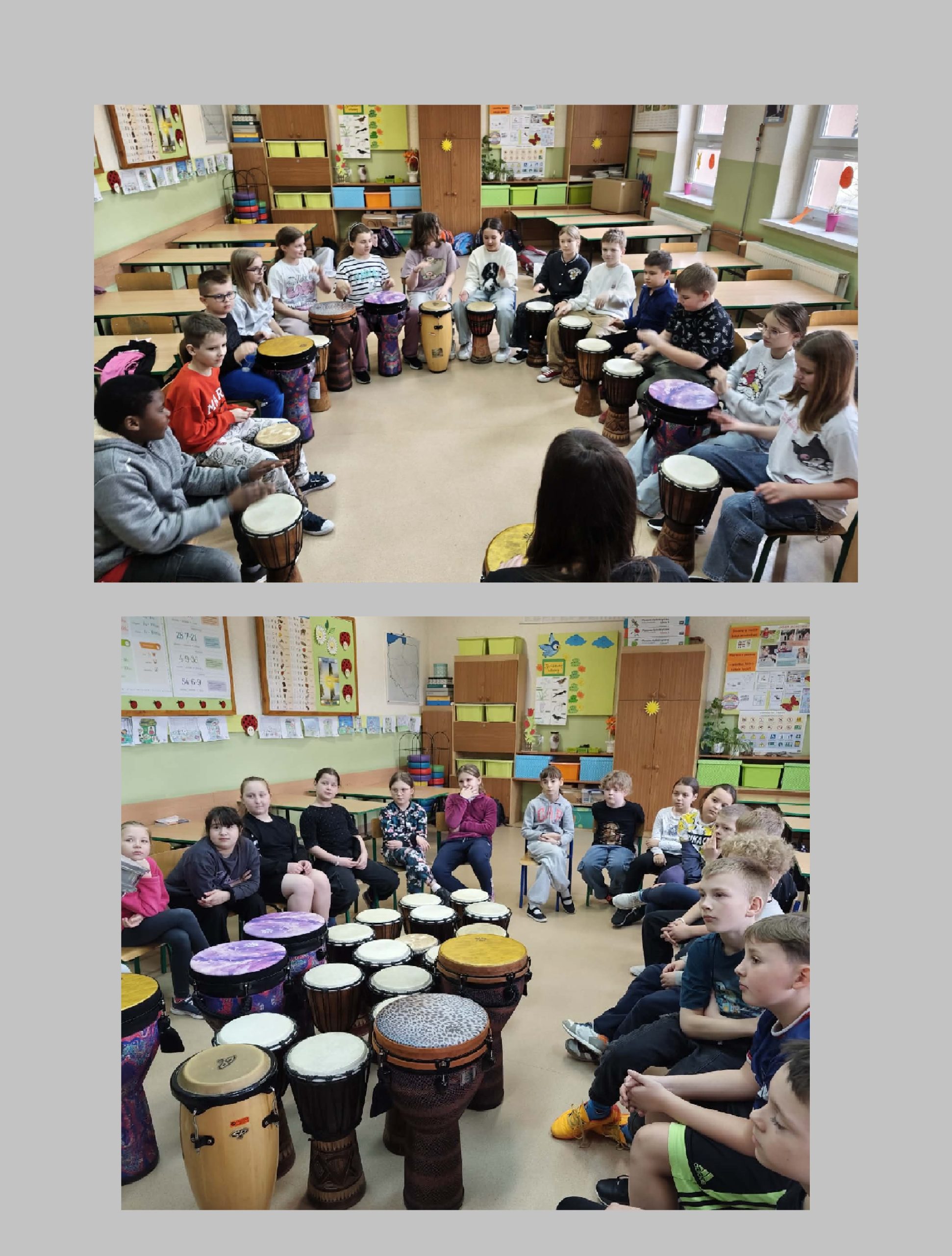 Dnia 17 marca 2026 uczniowie klasy IIIb i IVb wzięli udział w zajęciach bębniarskich pod hasłem „Poczuj w sobie rytm”. Ich celem było rozwijanie kreatywności dzieci, ich koordynacji i pamięci, poznanie instrumentów, takich jak: djembe, darabuka, conga oraz zabawa przy wspólnym muzykowaniu. Podczas zajęć uczestnicy mogli wyrazić swoje emocje bez słów, a przez to zredukować napięcie i stres.
